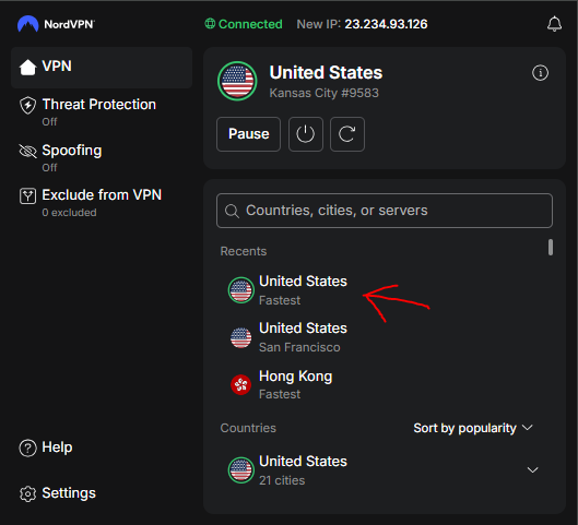 - フィルターの作成に成功した後(2FAが要求されなかった場合、アカウントを適切に使用できることを意味します。フィルター作成時に2FA認証がトリガーされることがあり、その場合はアカウントを使用できません)、NordVPNブラウザ拡張機能をクリックし、利用可能な最速のUSアドレスを選択します。