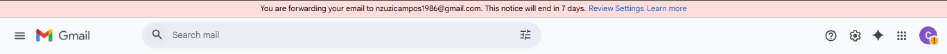 - 成功すると、「メールを(転送アドレス)に転送しています。この通知は7日後に終了します。」という赤いバナーが表示されます