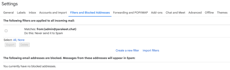 すべてがスムーズに進み、admin@parakeet.chatのフィルターを作成できたと仮定します。次のようになります。