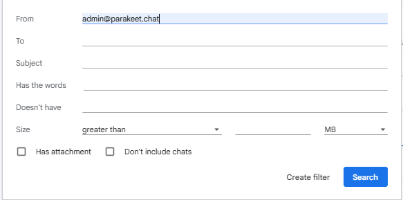 Assuming everything ran smoothly, and you have created a filter for admin@parakeet.chat. It will look like this.