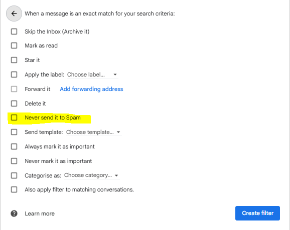 - Click Create filter → Never send it to Spam